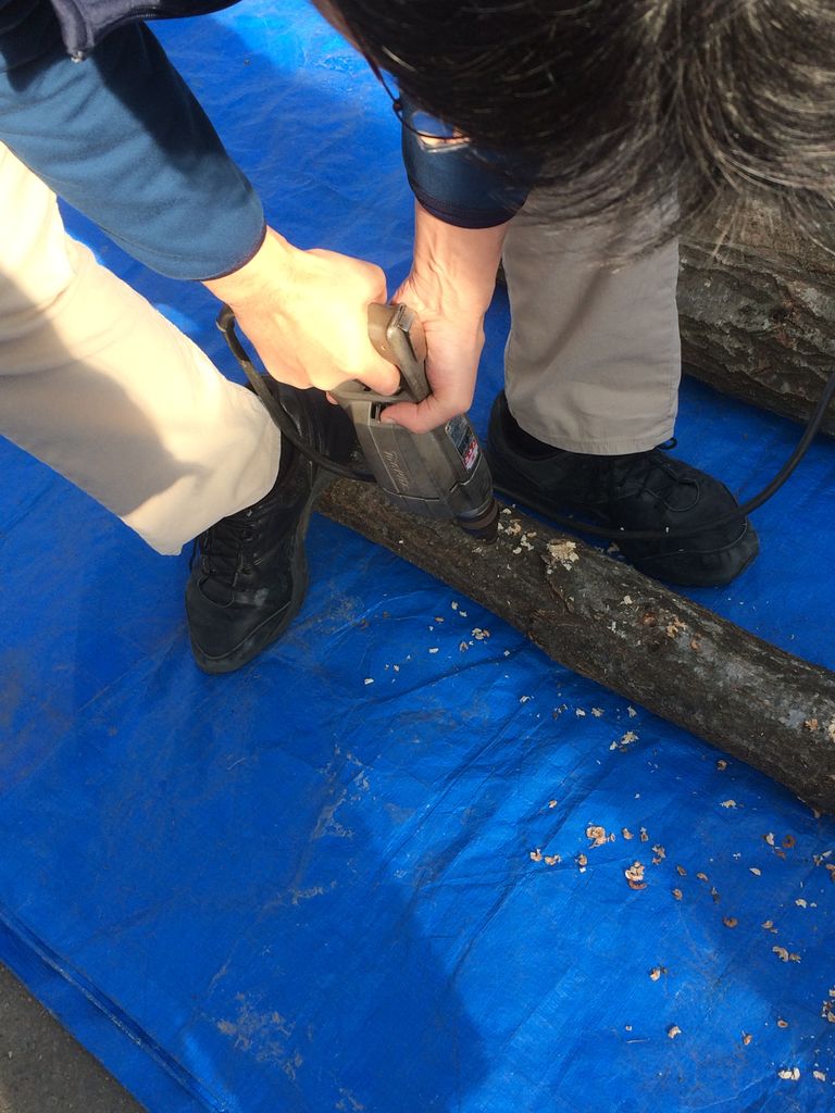 シイタケは出始めてから4~5年、春と秋に収穫できるそうですが、今回菌を打ち込む原木は来年の秋に収穫できる見込みなんだとか。ただし太い原木は菌が張り巡るのに時間がかかるため出始めが遅くなる場合があるそうで、下手すると再来年になってしまう可能性もあるらしい。そのかわり太い分栄養分がいっぱいあるわけで、木の養分を吸い尽くすまで収穫できる、つまり原木のもちが良いということでもあるらしい。