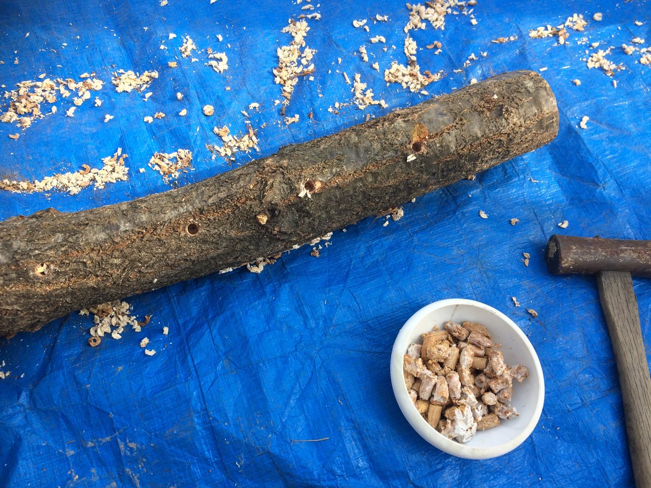 そして金槌で菌を打っていきます。白い皿の中に入っているのがシイタケ菌にまみれた駒です。