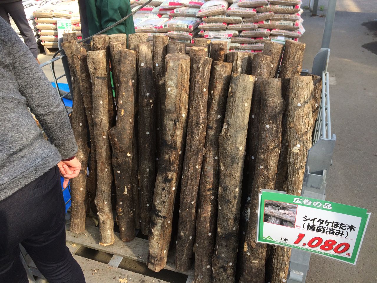 この写真は体験コーナー脇で販売されていた植菌済の原木です。植菌済の原木は「ほだ木」というようです。