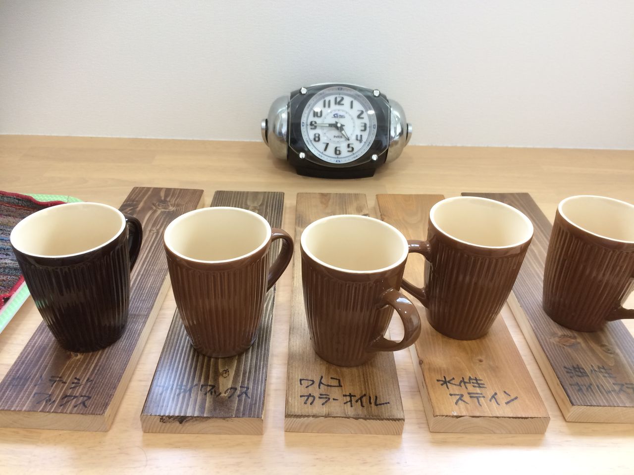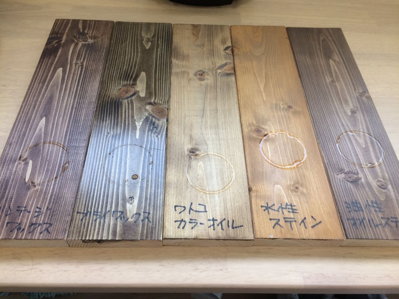 ②そのマグカップを同時にビンテージワックス、ブライワックス、ワトコオイル、水性ステイン、オイルステインを塗ったそれぞれの板の上に5分間置く。