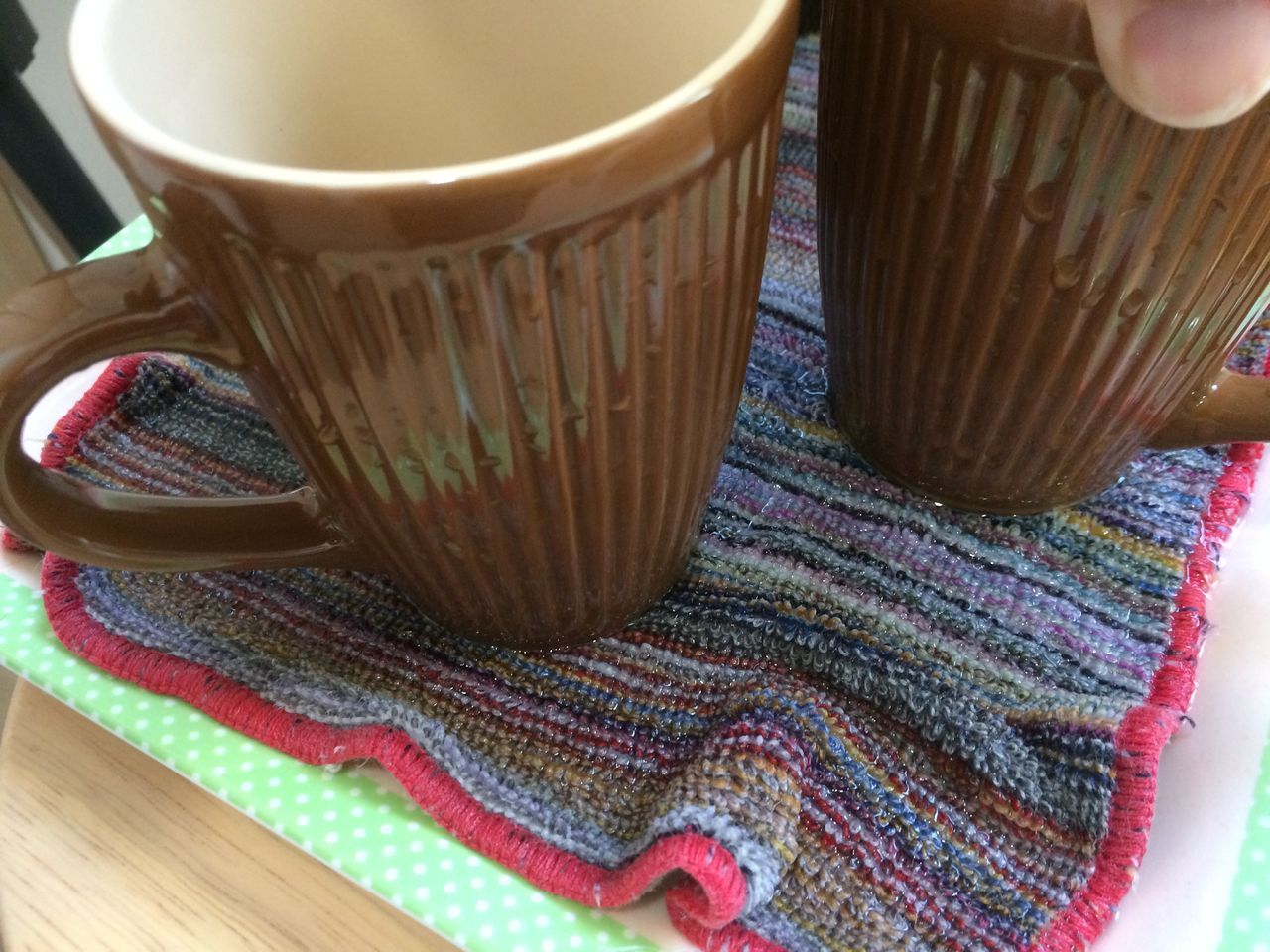 まずは、写真のように塗れ布巾の上にマグカップを置いて底面が充分濡れるようにしました。