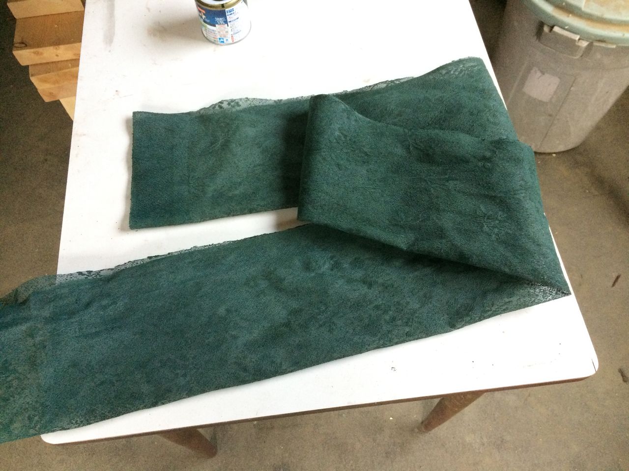 以前の家で使っていたレースのカーテン、何か使うことがあるかもととっておいたものが珍しく今回役に立ちました。まずはカーテンを幅30cmくらいの帯状にカットしました。卓球台のネットは高さが15.25cmですので、折り曲げてそれくらいになる計算です。