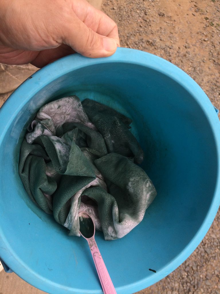 緑色の水性塗料をバケツに入れて、漬け込んで着色してみます。