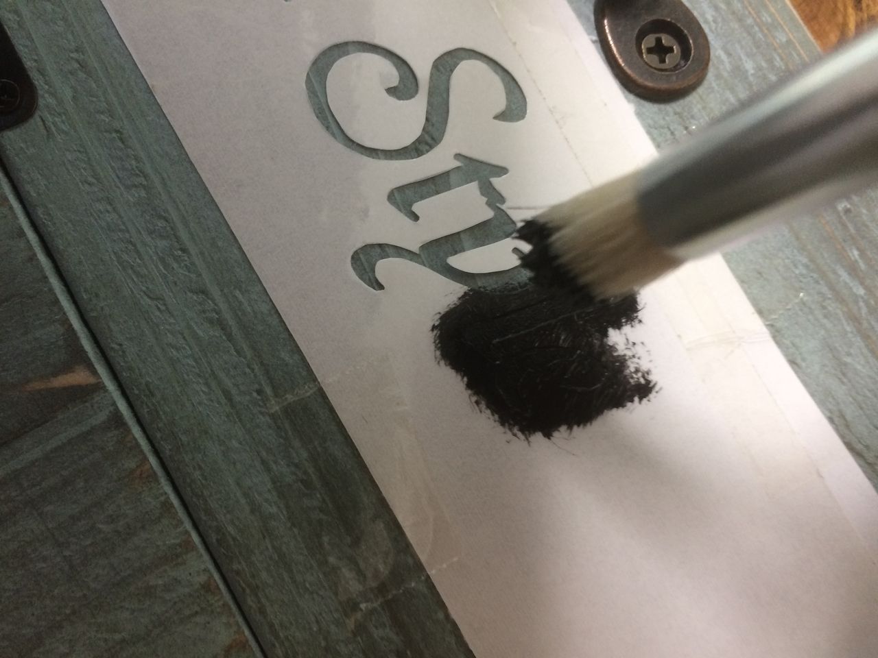 切り抜いた文字に色を塗っています。100均の安物アクリル絵の具でステンシル用筆を押すように塗るのがよさそうです。塗料のつけすぎ厳禁です。多少カスるくらいで充分です。