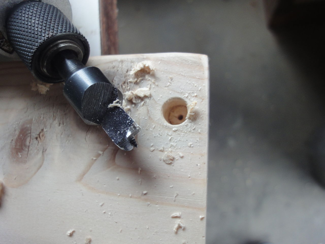 ダボ穴をあけて板の厚みを消すことにしました。これでビスが充分届きそうです。