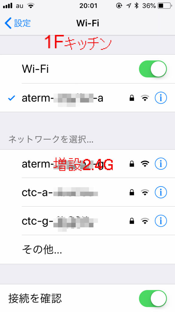 これまでスマホでこの2つの電波ともWi-Fi自動接続に設定してありました。実際にはどっちが繋がっていたのか意識していませんでしたが家の中どこにいてもこれまでは不便なく繋がっていたのでヨシとしていました。