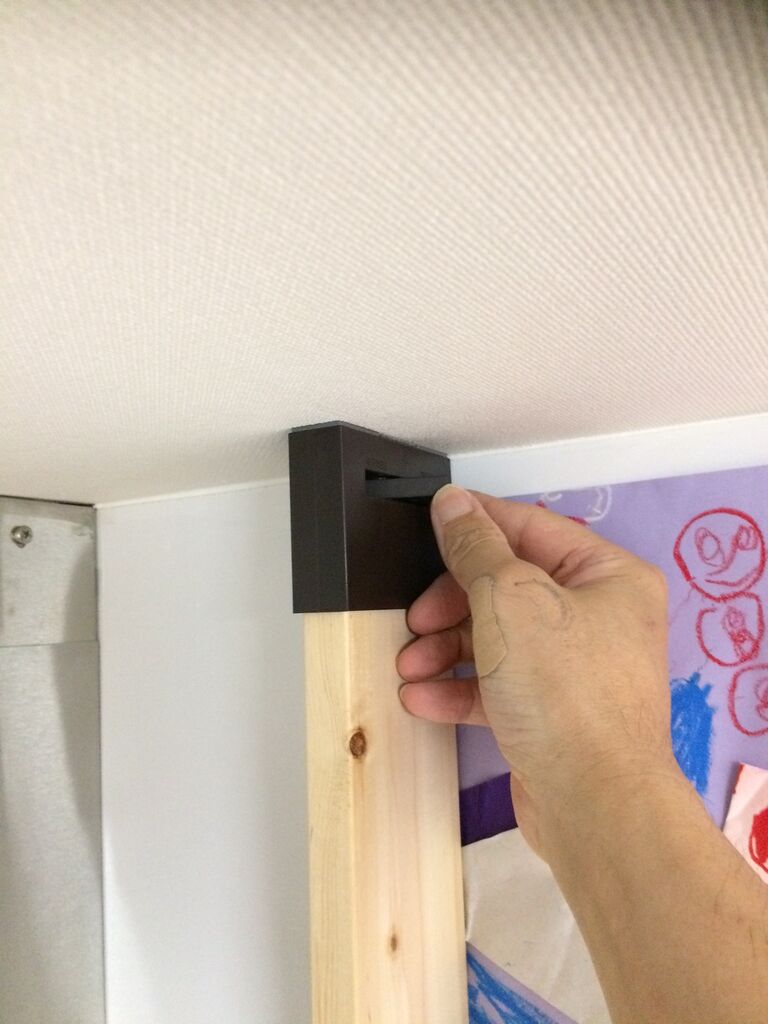 ワンバイフォーの板を柱のように立てて固定するグッズです。これを立ててここにフックを取り付けました。