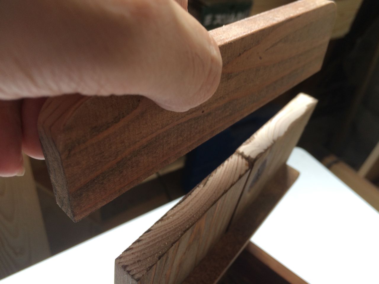 持ち手を持ち上げた時、力が加わる接合部分は、どのように繋ごうか迷いました。木工用ボンドだけではもちろん弱いですし、添え木をつけるとカッコ悪くなってしまいます。