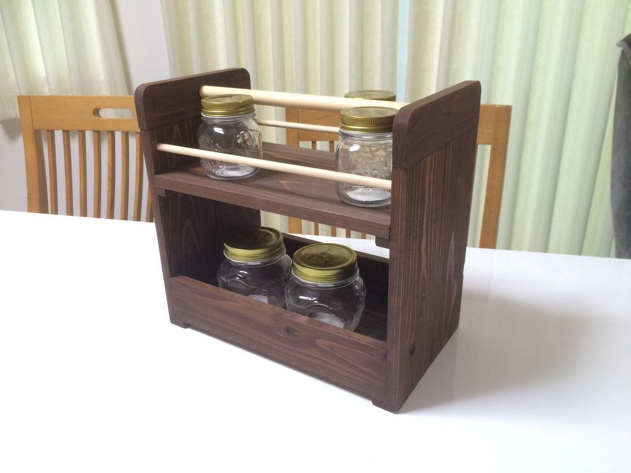 今回はスパイスラックの作成にチャレンジした様子を紹介します。ダイニングテーブルに一度に調味料やらサプリメントやらを運べるように持ち手がついたものが欲しいと思っていました。
