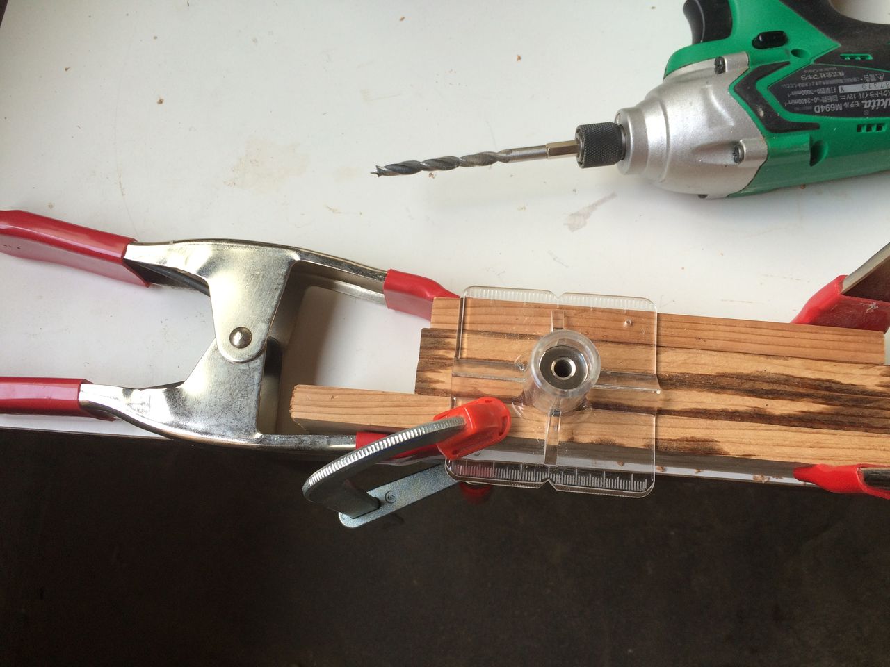 ドリルガイドを安定しておくために、当て木して押さえました。