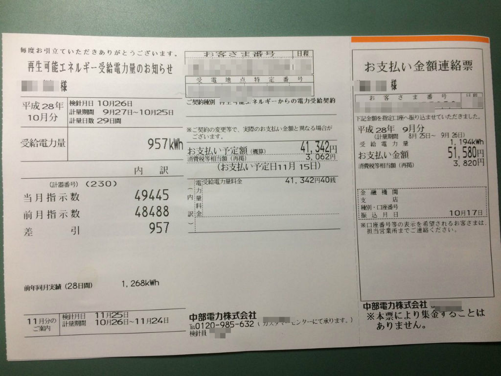 10月売電金額 41,342円 27年48,859円 26年54,777円 25年46,200円