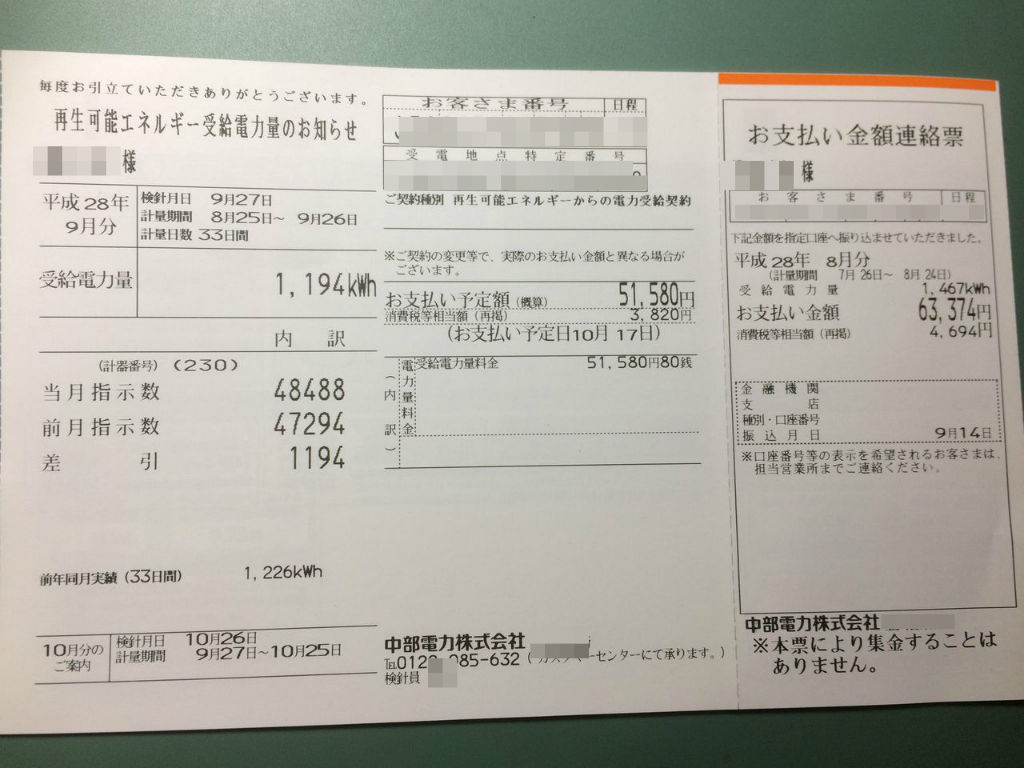 9月売電金額 51,580円 27年58,968円 26年52,963円