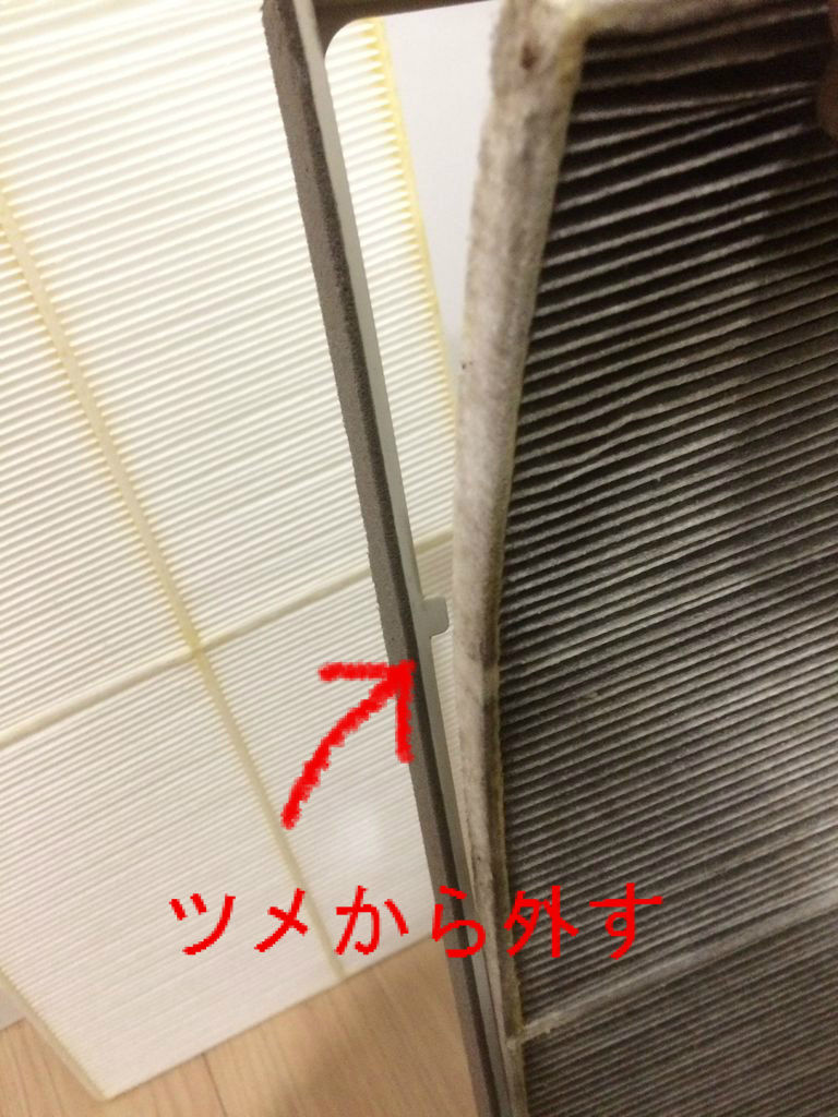 フィルターを枠から外します。ツメ部分の引っ掛かりを外すだけです。