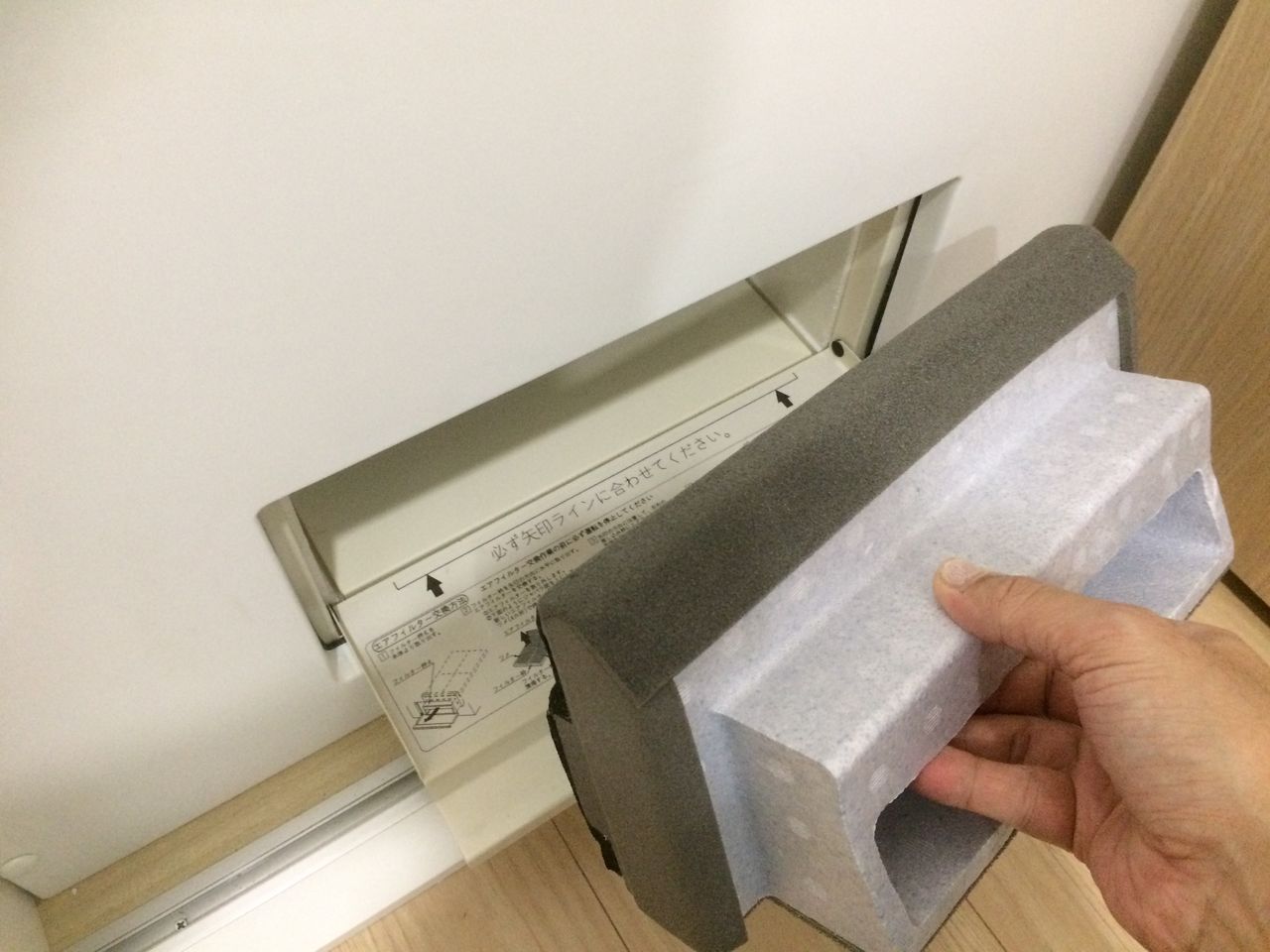発泡スチロールの蓋を外します。外気を最初にフィルターで濾すからでしょう。こんなとこまで断熱仕様です。