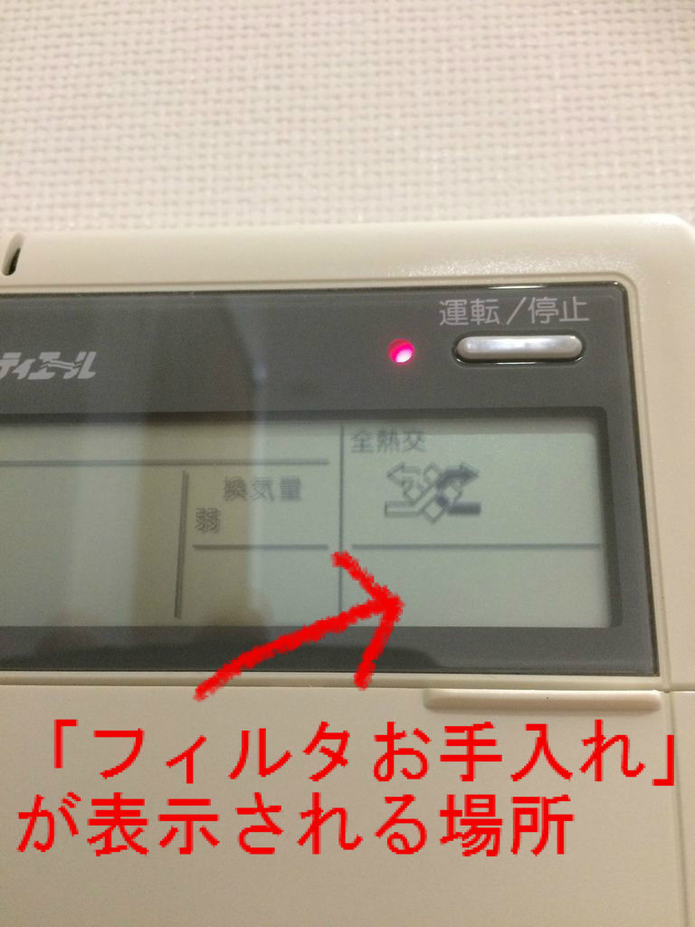 まずは、壁に設置してあるコントローラーのこの部分の説明から。本来ならフィルターの交換が必要な頃に