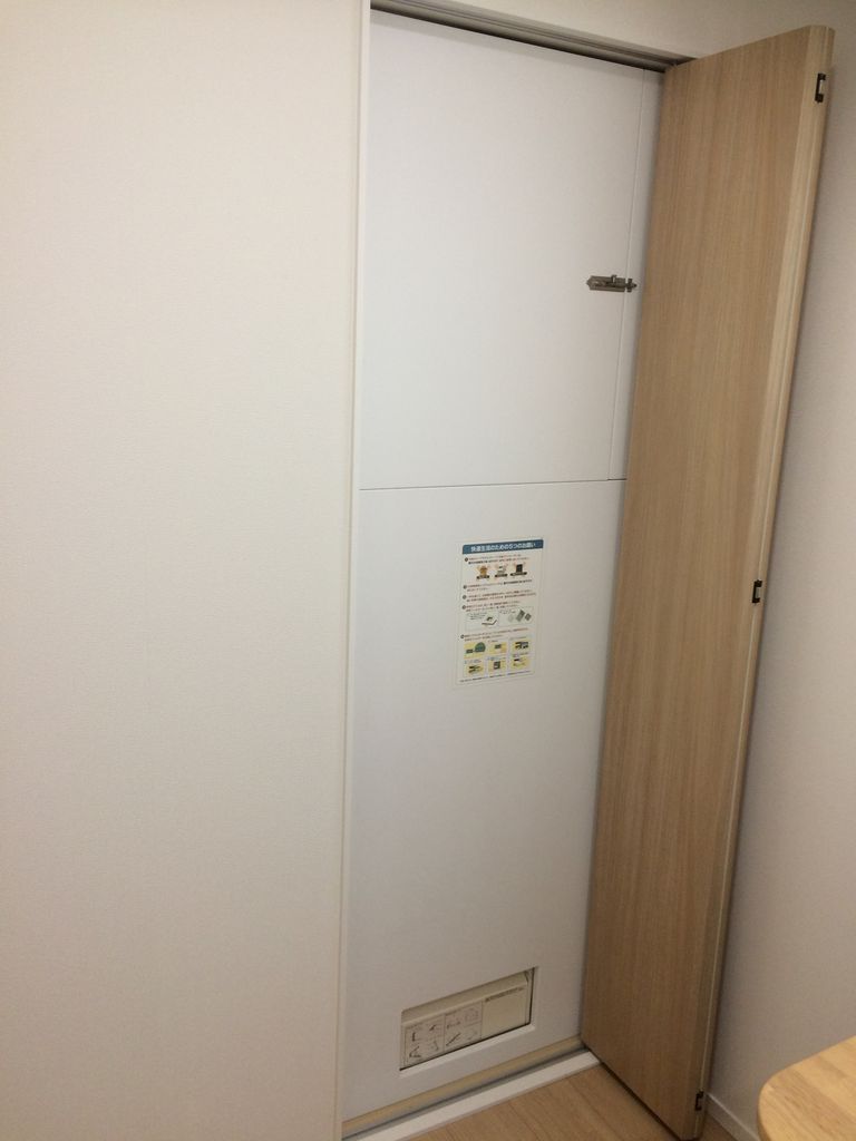 ロスガードはよっちの書斎に1/2畳ほどのスペースをとっています。作業を始める前にまずは、コントローラ側でロスガードの運転を止めます。そしてロスガードが収納されている壁のドアを開けます。